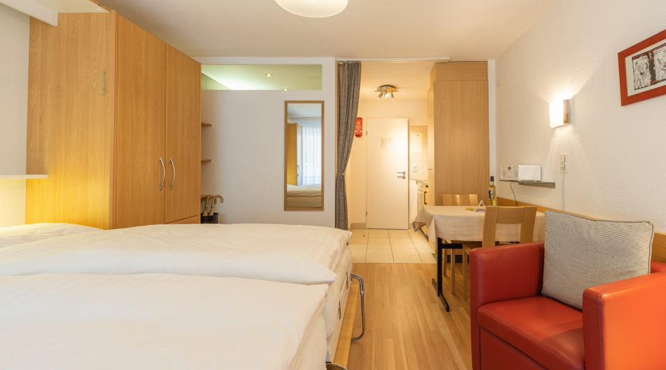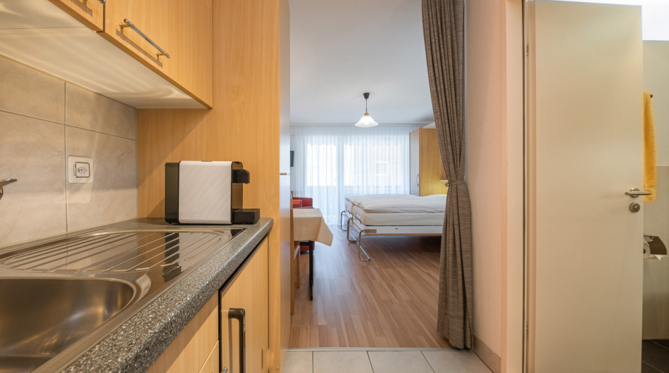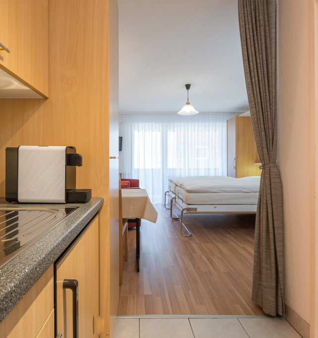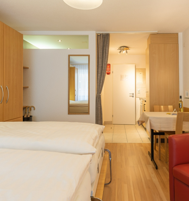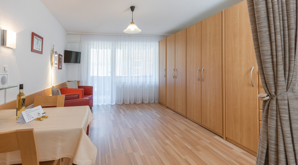 Bright furnished living and bedroom with two fold-away beds, armchairs, coffee table and a dining table. Cable-TV, radio and free WLAN. Fully equipped kitchenette with a ceramic hob, oven, fridge, fondue and raclette accessories and an espresso machine. Newly renovated bathroom with walk-in shower, toilet, hairdryer.
